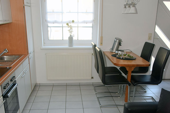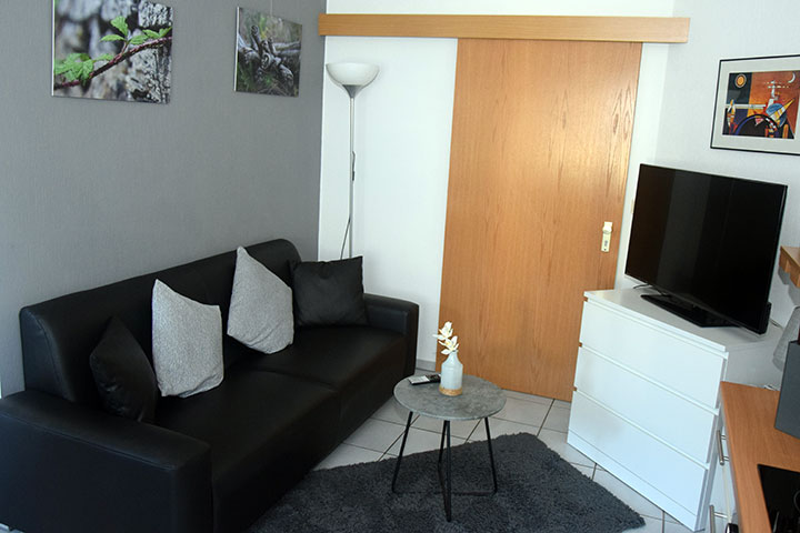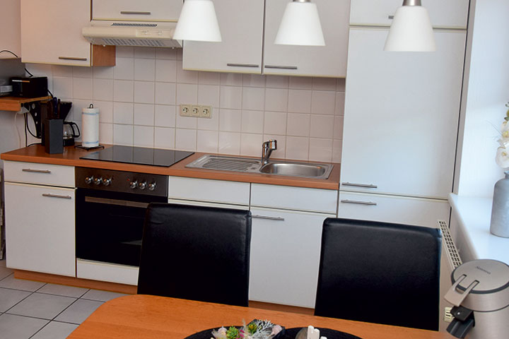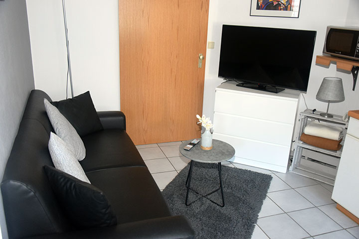 - Wohnraum mit Essplatz, Küchenzeile (Kühlschrank, Einbauherd mit Ceranfeld, Kaffeemaschine, Toaster, Wasserkocher, Mikrowellengerät, Eierkocher) und Wohnecke mit Couch und Sat-TV